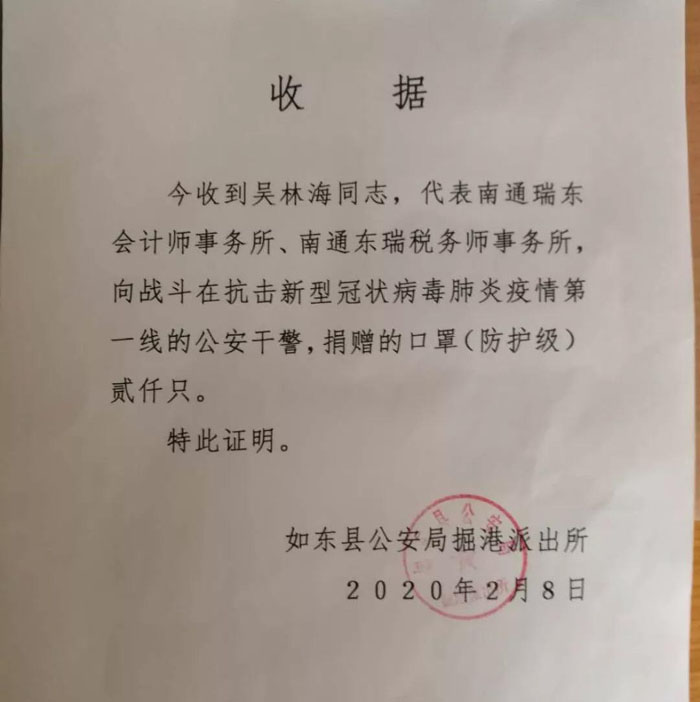 202028,協(xié)會(huì)會(huì)員單位——南通瑞東會(huì)計(jì)師事務(wù)所有限公司向戰(zhàn)斗在抗擊新型冠狀病毒肺炎疫情第一線的如東公安干警捐贈(zèng)口罩2000只。
